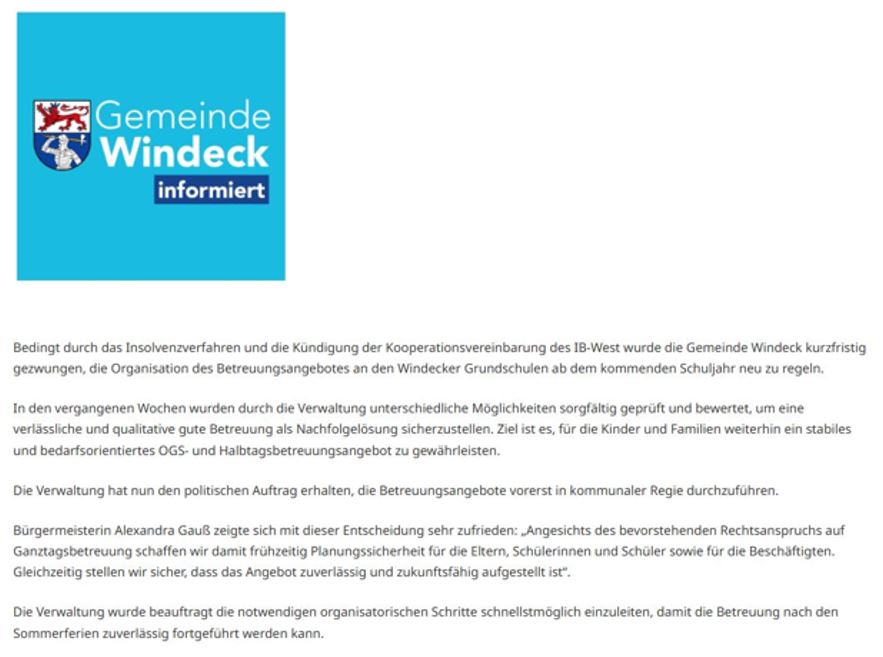 Fortführung der OGS-Betreuung an Windecker Grundschulen – Gemeinde Windeck übernimmt
