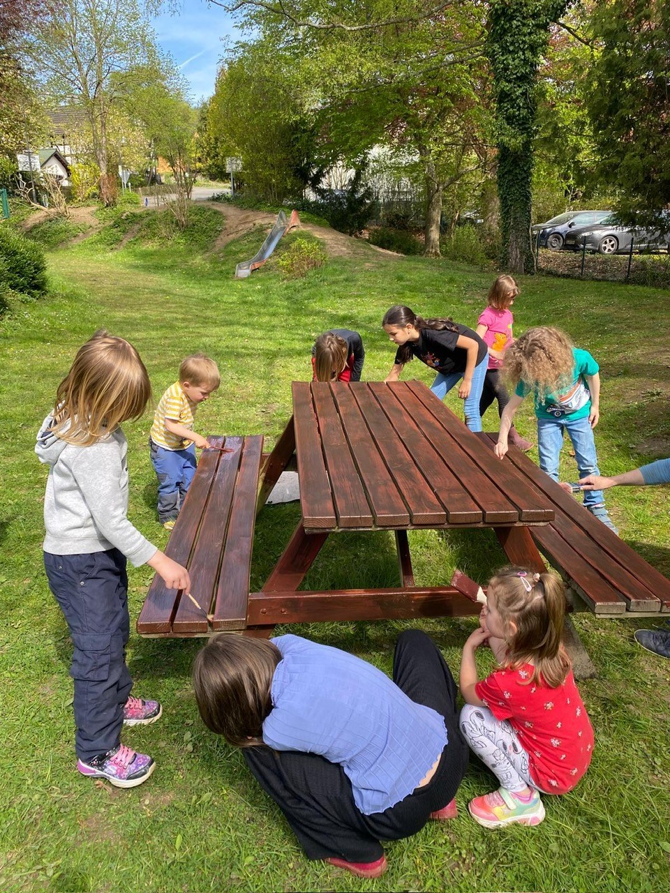 Am Samstag, den 18.04.2026, hatten wir Frühjahrsputz in der Schule. Viele Eltern und Kinder waren da um zu helfen. Wir haben Unkraut gejätet, im Schulgarten Hecken geschnitten, einen Apfelbaum gepflanzt, die Bilder an der Wand geputzt, die Hochbeete erneuert, Blumen gepflanzt, einen Tisch und Bänke gestrichen, ein Regal aufgebaut und Haken in der Spieleausleihe befestigt.